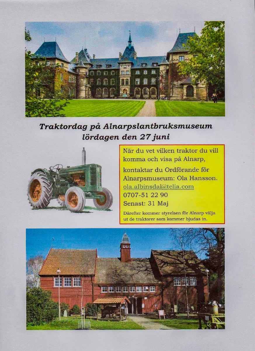 Anmäl en traktor till traktordag på Alnarpslantbruksmuseum den 27 juni. Sista anmälningsdag 31 maj.Se vidare under kommande aktiviteter.