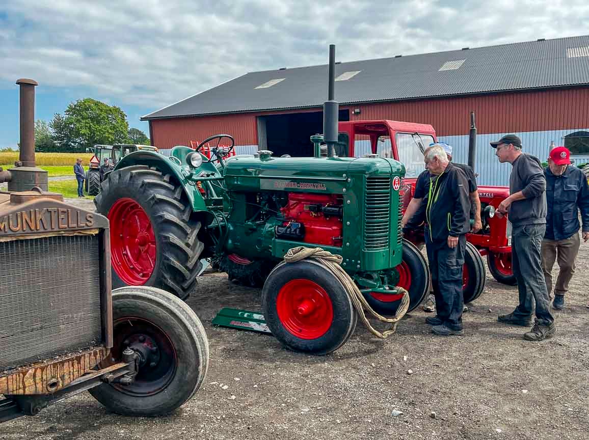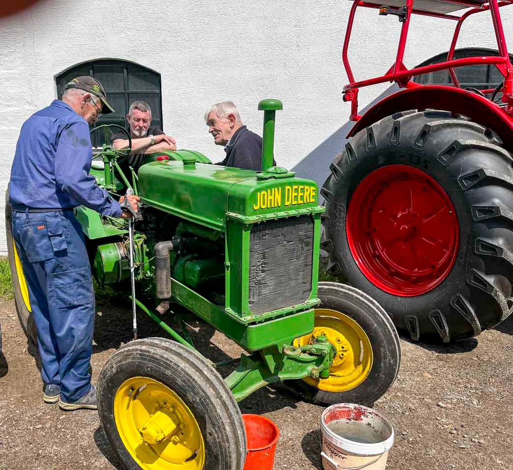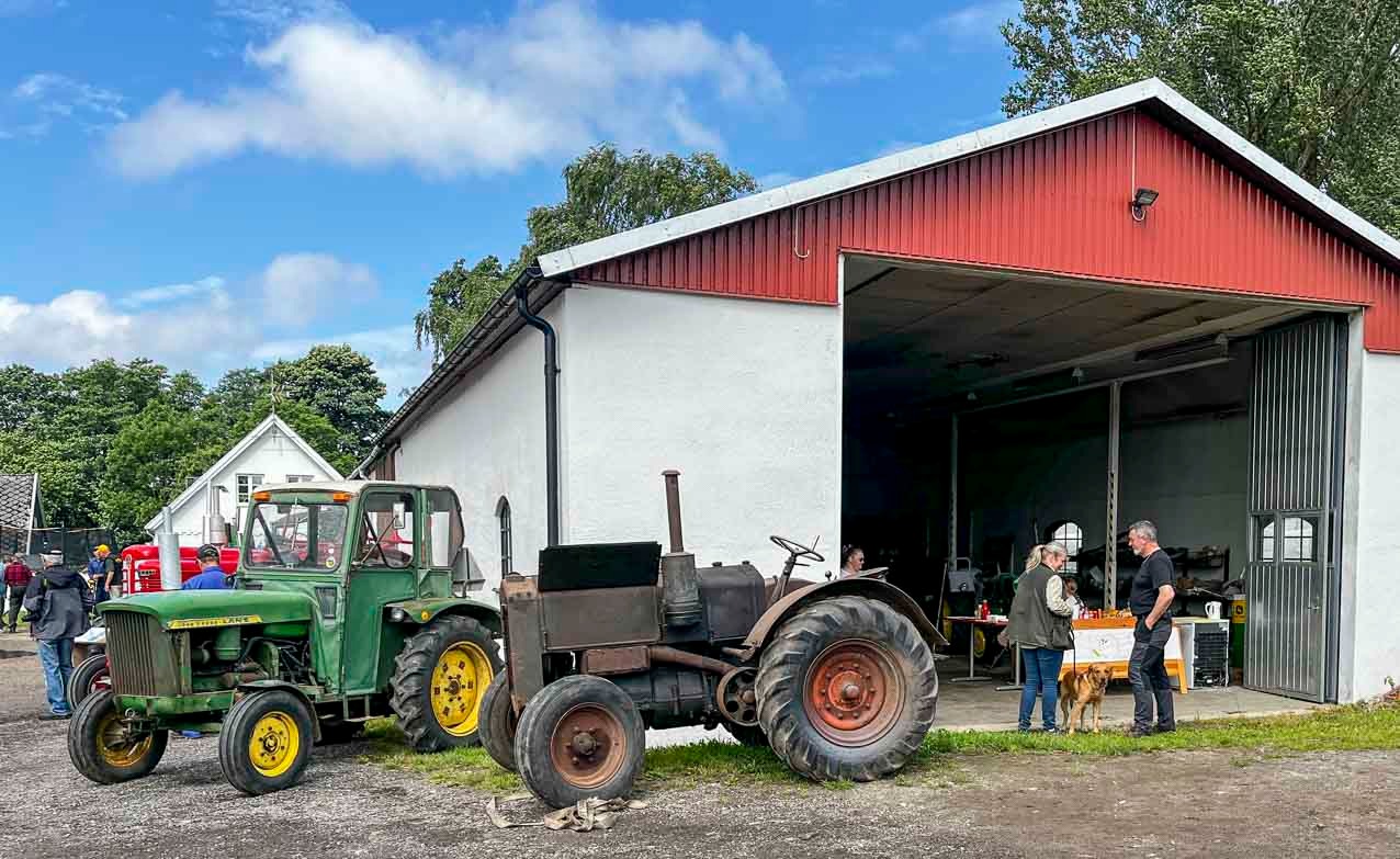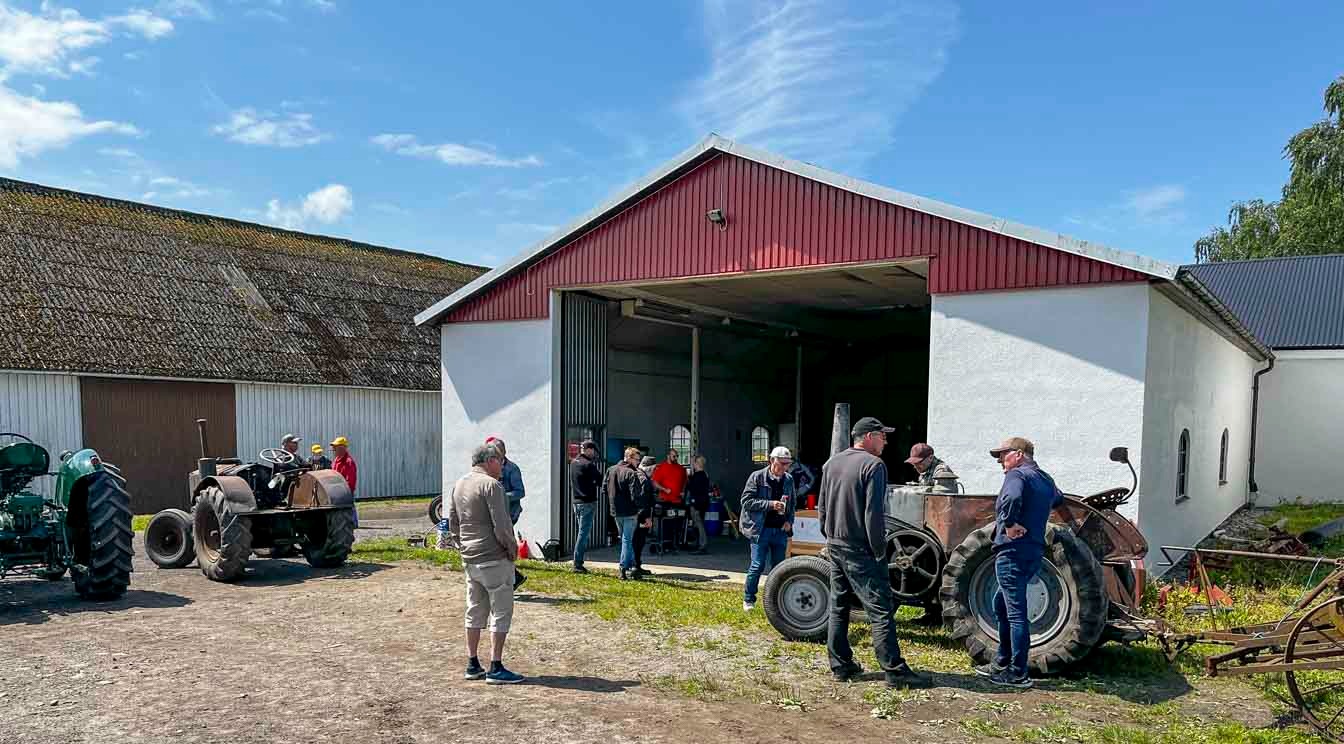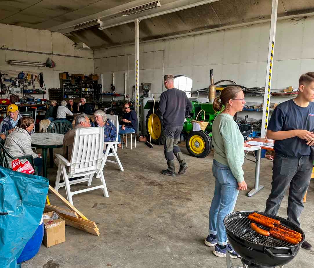 Verkstaden hade utrymts för att ge plats åt fika och grillkorv. I bakgrunden skymtar en Lanz under renovering.