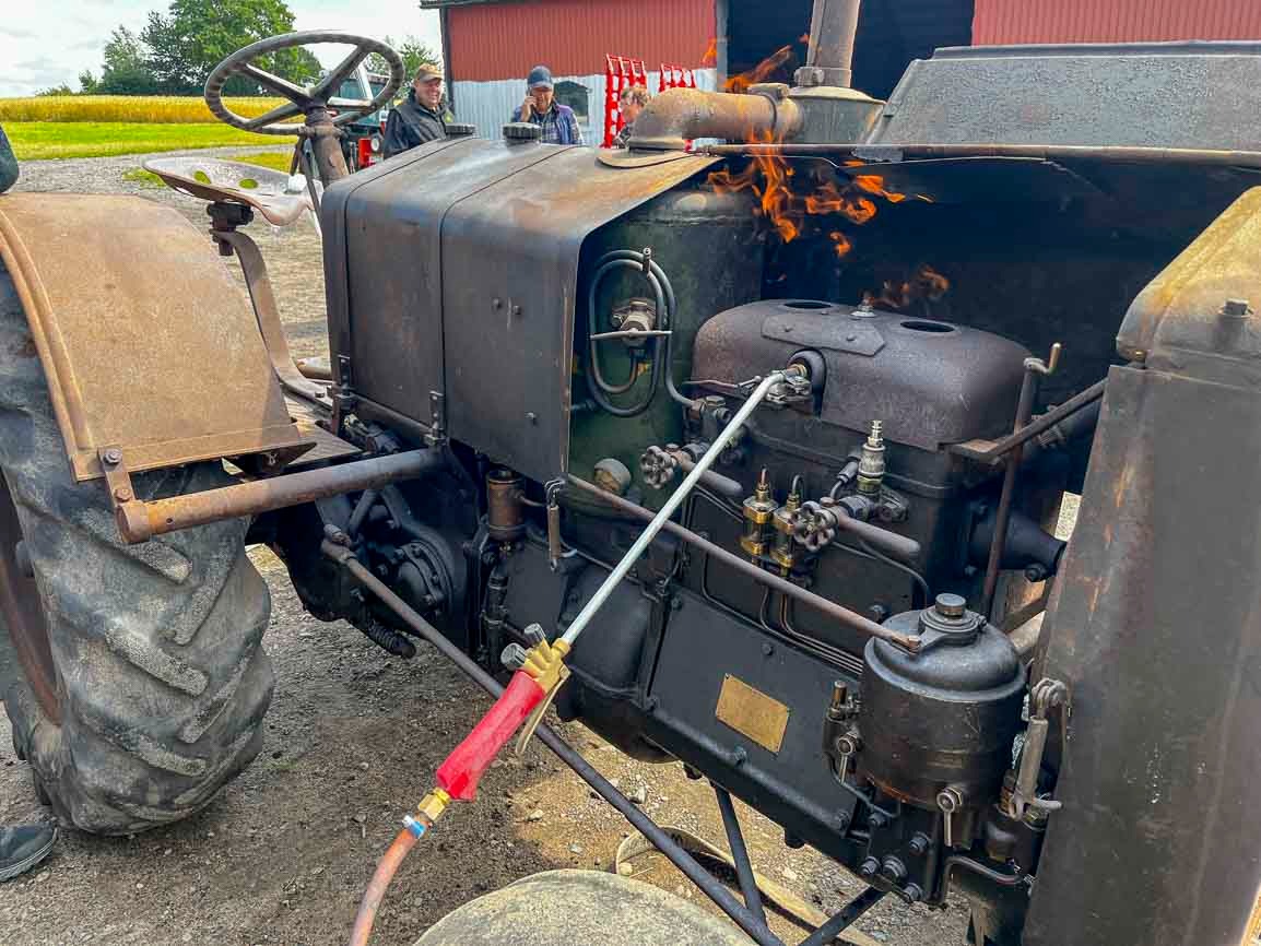 Munktell typ 25 under uppvärmning. Som ni ser så fuskar jag med gasol. Vi drog igång den med Stefans GMW35. När Munktellen startade körde jag rakt in i GMW:n. Konstigt nog blev det inga skador.