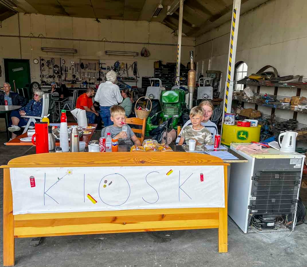 Barnen på gården hade fixat en kiosk med gott kaffe och fina kakor. Clara Hansson hade bakat i flera dagar. Det serverades även grillkorv.