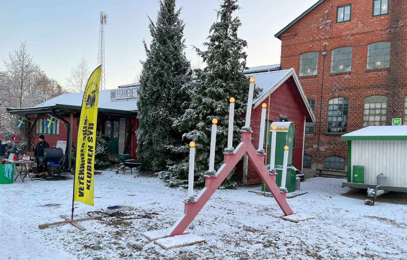 Egentillverkad julljusstake i maxiformat. Grillad korv till de frusna.0125