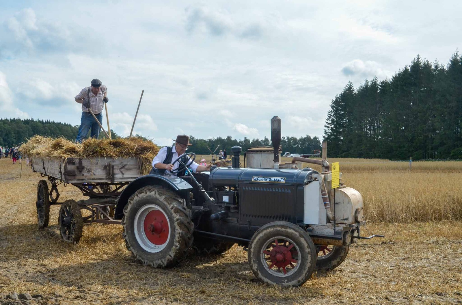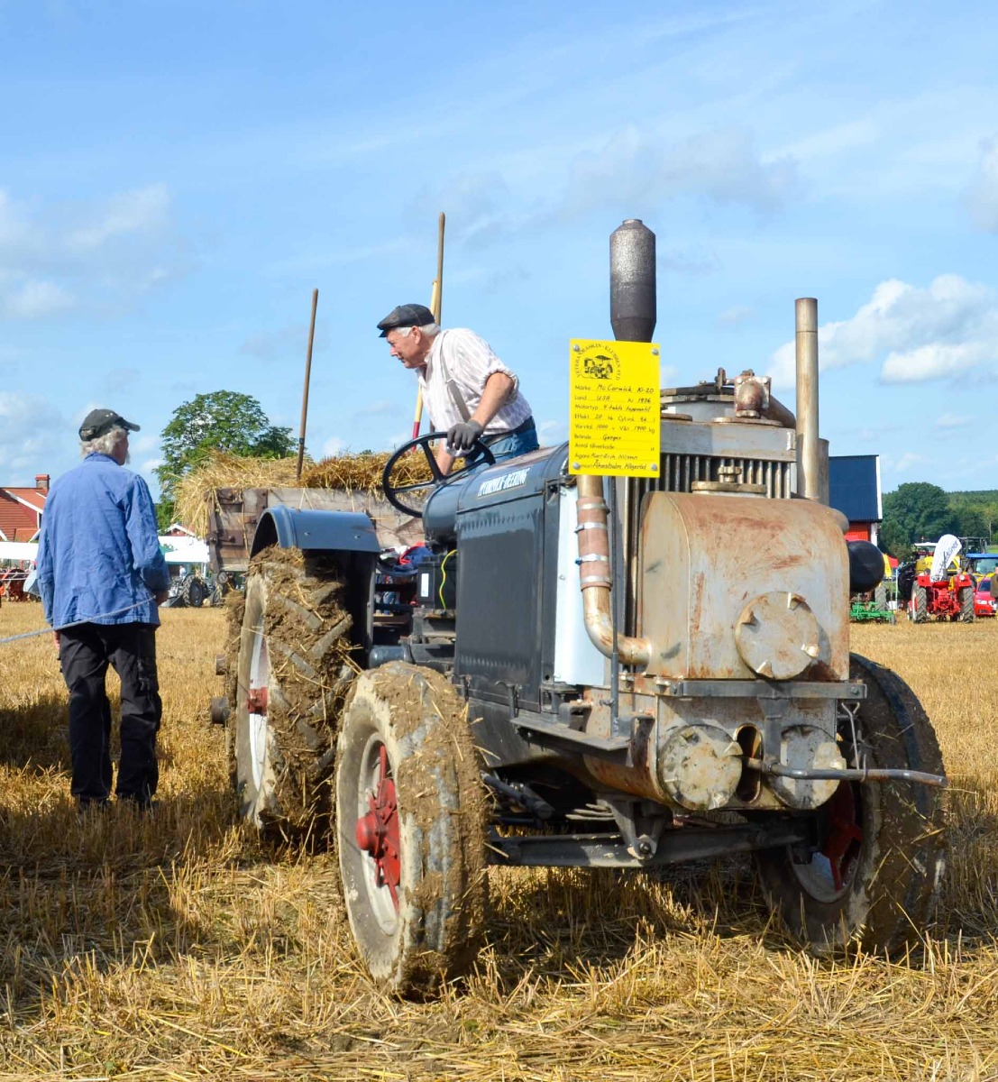 abj2021Deering 10-20 har kört fast med tröskan. Mannen som passar säckarna får en paus.