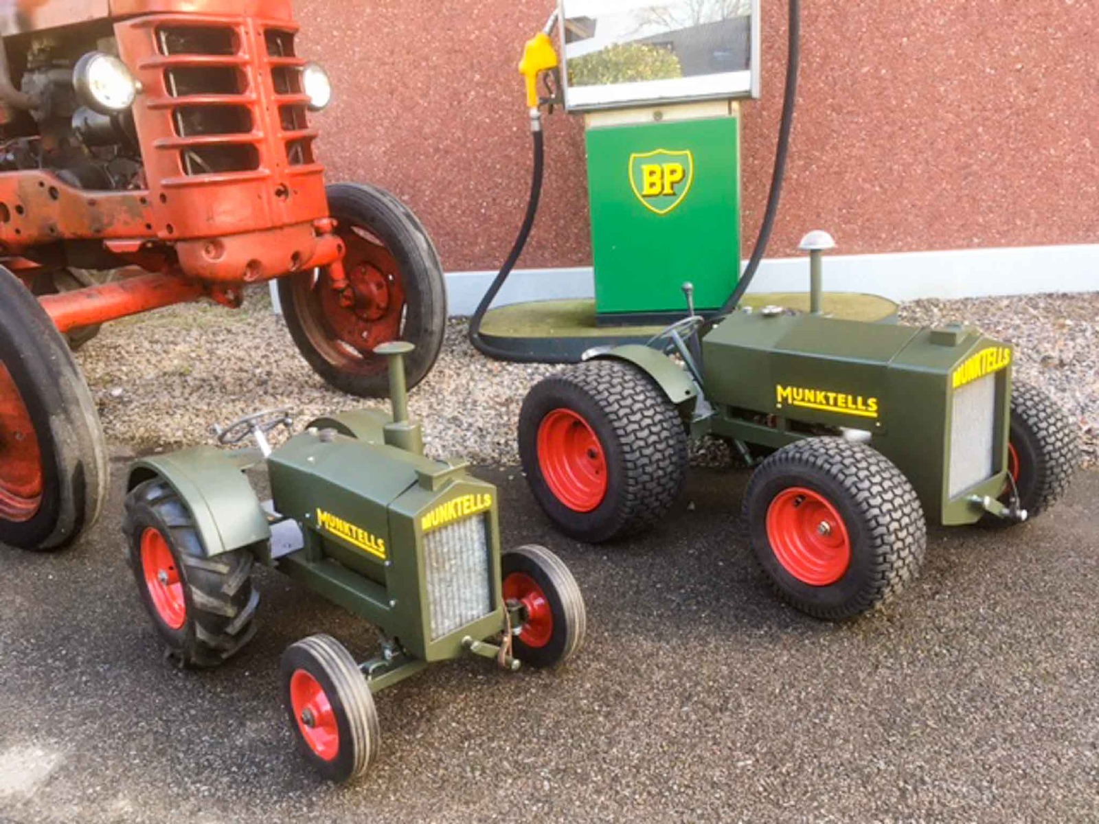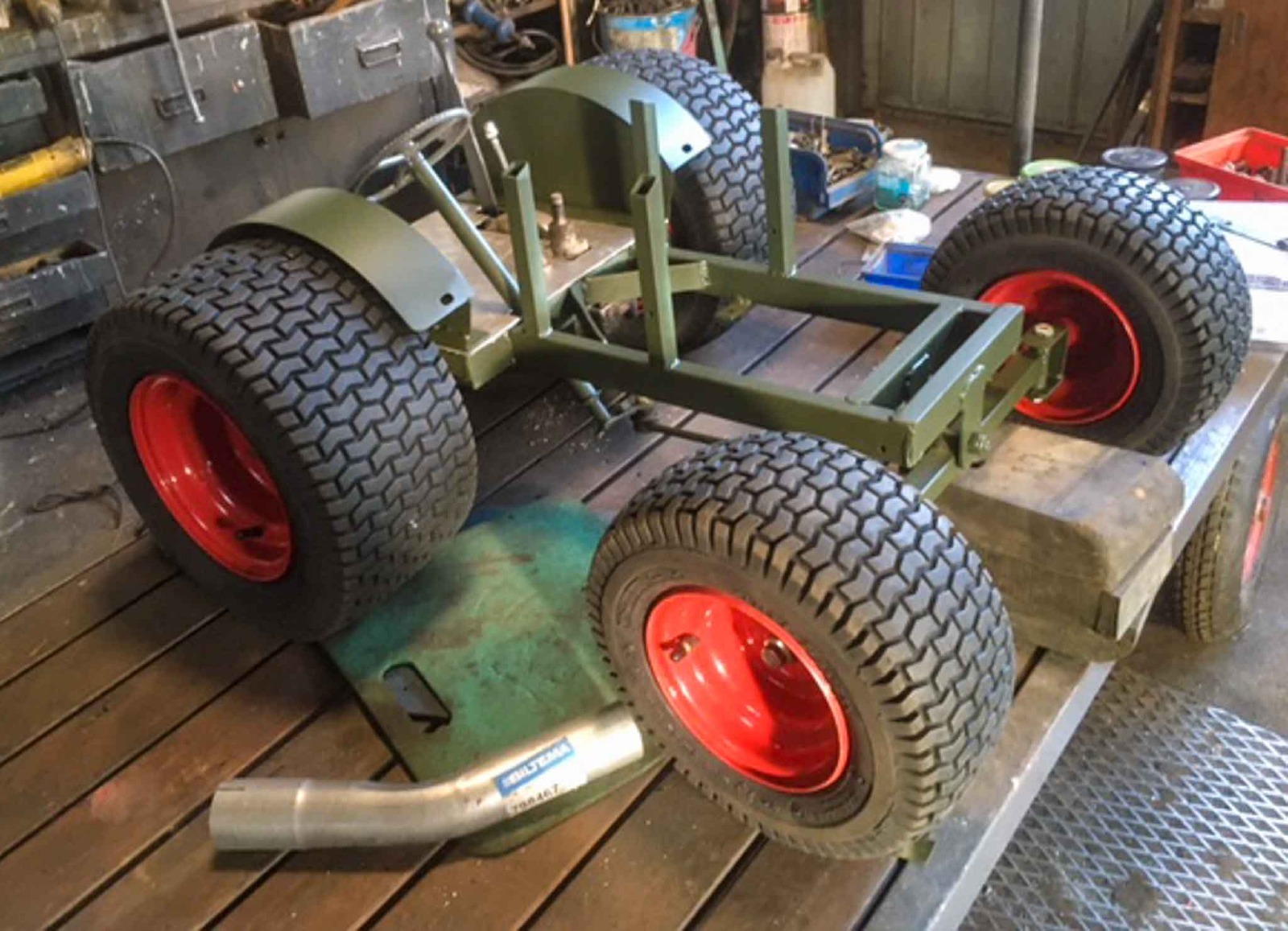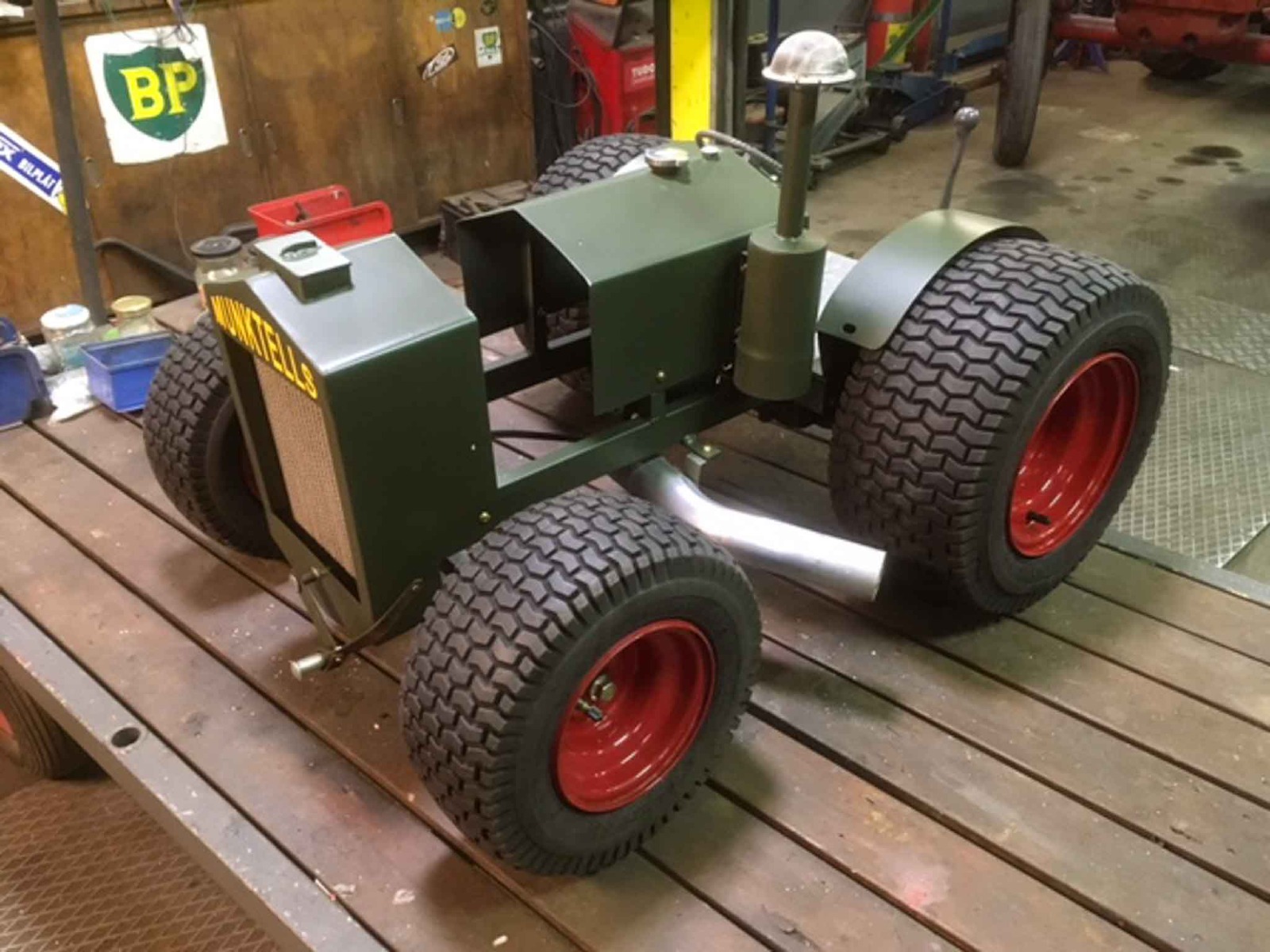 Det är ju trots allt bara början av februari. En liten upprensning och städning i verkstaden kanske?! Och där låg ju transporthjul från jordfräs och bakaxel och fyra kompletta hjul från åkklippare som blev över från tidigare bygge. Ska de åka ut? Nä, vi bygger! Fram med svets, vinkelslip och färgspruta! Det resulterade i en mini-och en monster-Munktells 25. Ett bra tips; ha gott om restbitar av fyrkantsprofil, plattjärn, vinkeljärn, rör, plåt och skruvar i olika storlekar. Lite fantasi och glöm inte tumstocken! Även dessa kommer att visas på årsmötet på Mat och Harmoni