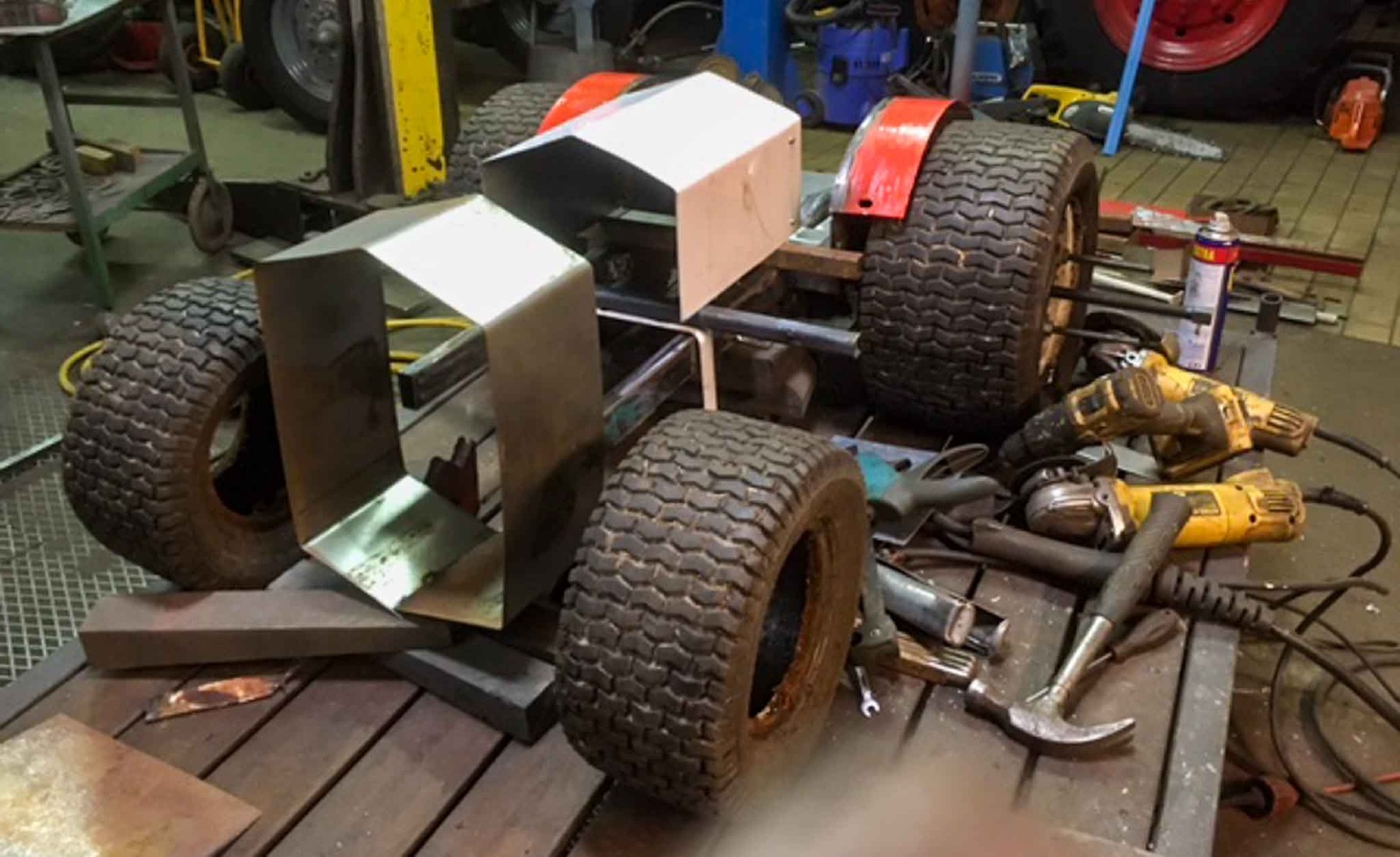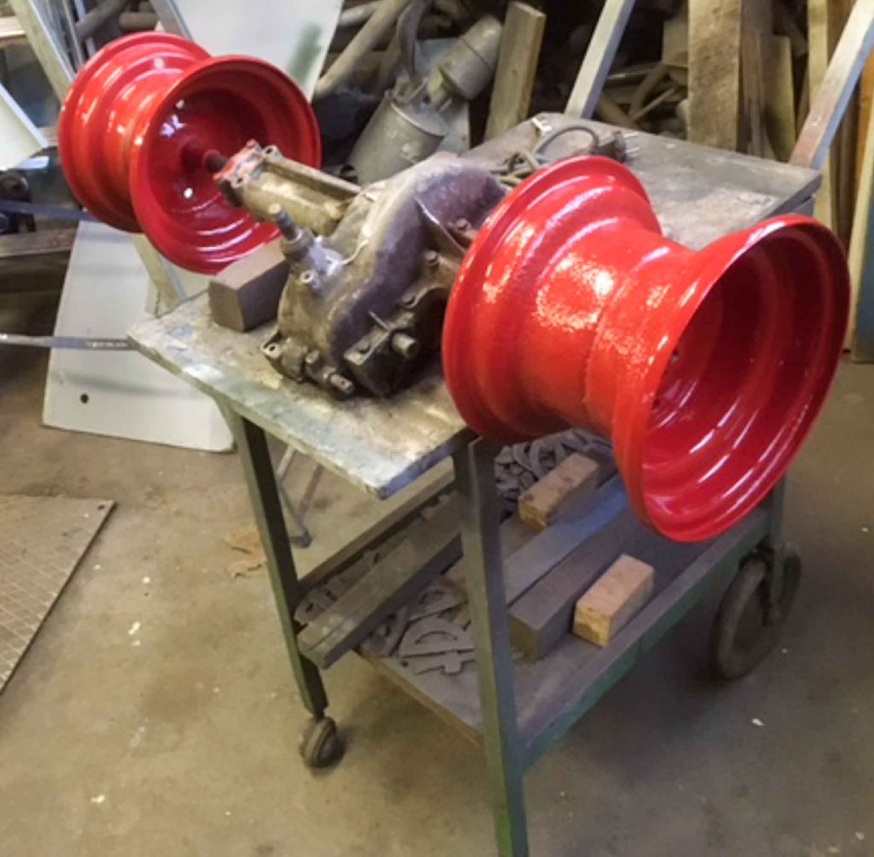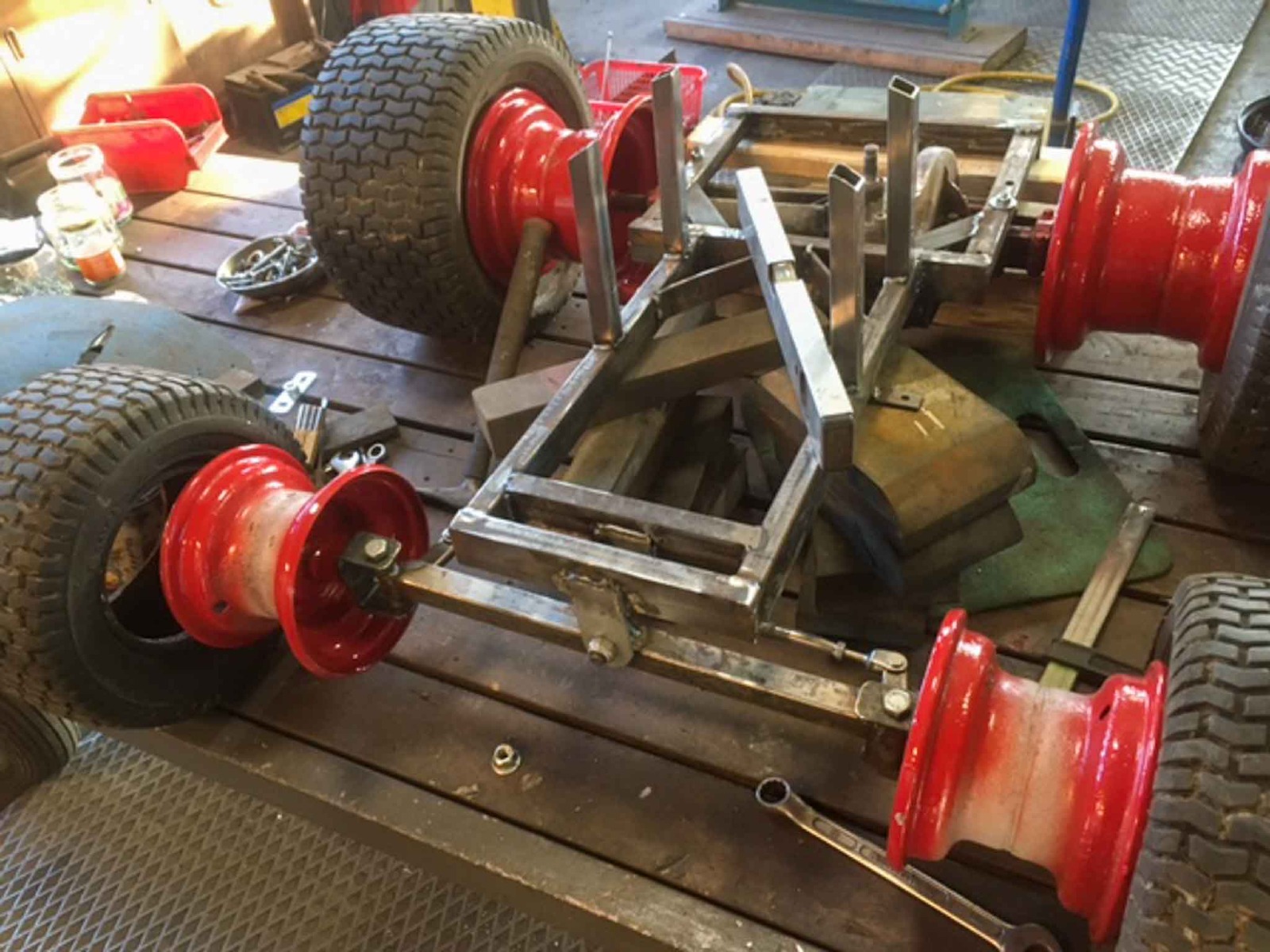 Det är ju trots allt bara början av februari. En liten upprensning och städning i verkstaden kanske?! Och där låg ju transporthjul från jordfräs och bakaxel och fyra kompletta hjul från åkklippare som blev över från tidigare bygge. Ska de åka ut? Nä, vi bygger! Fram med svets, vinkelslip och färgspruta! Det resulterade i en mini-och en monster-Munktells 25. Ett bra tips; ha gott om restbitar av fyrkantsprofil, plattjärn, vinkeljärn, rör, plåt och skruvar i olika storlekar. Lite fantasi och glöm inte tumstocken! Även dessa kommer att visas på årsmötet på Mat och Harmoni