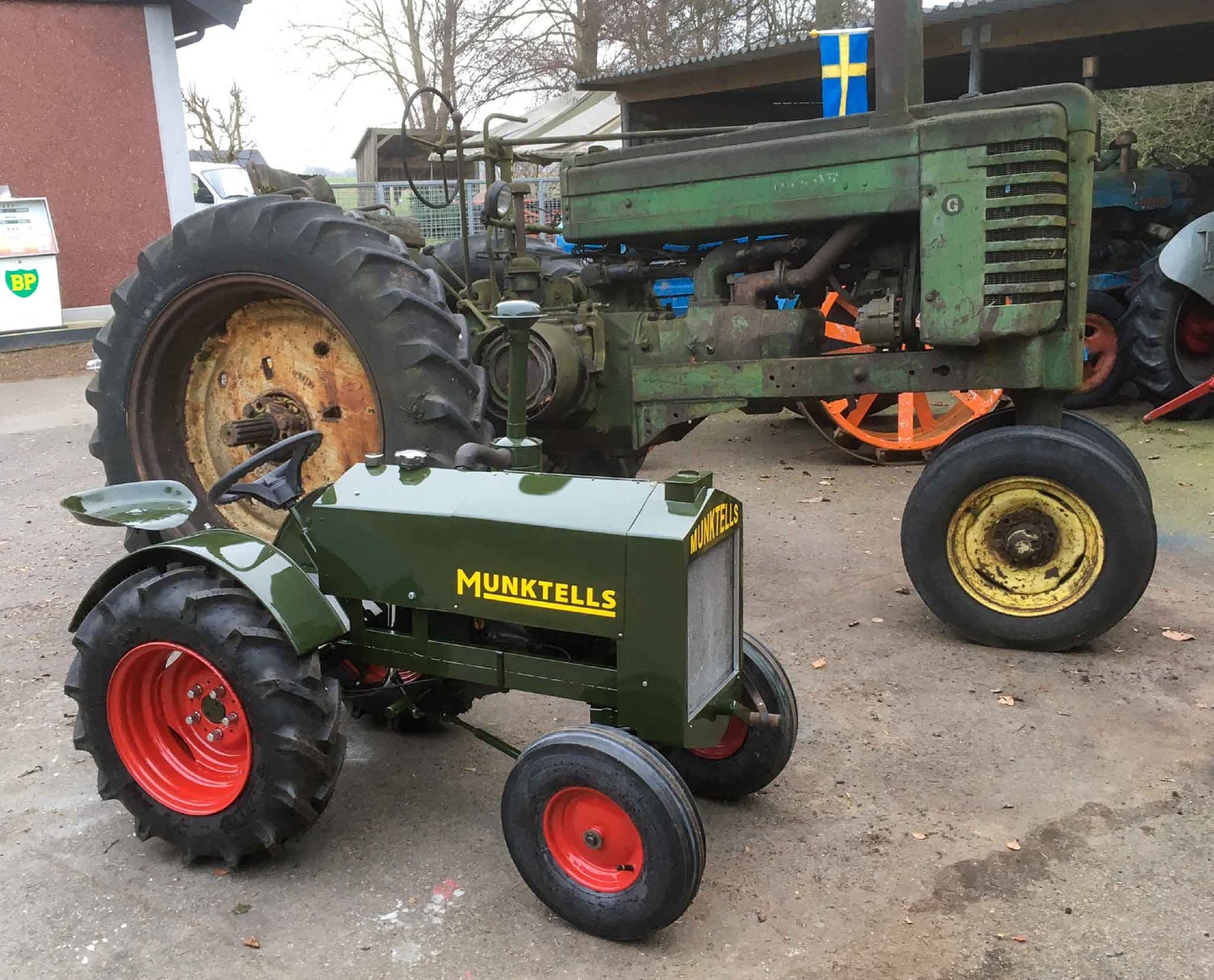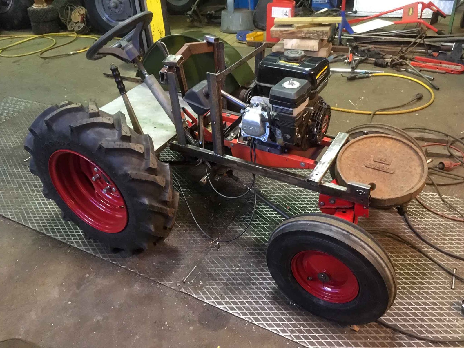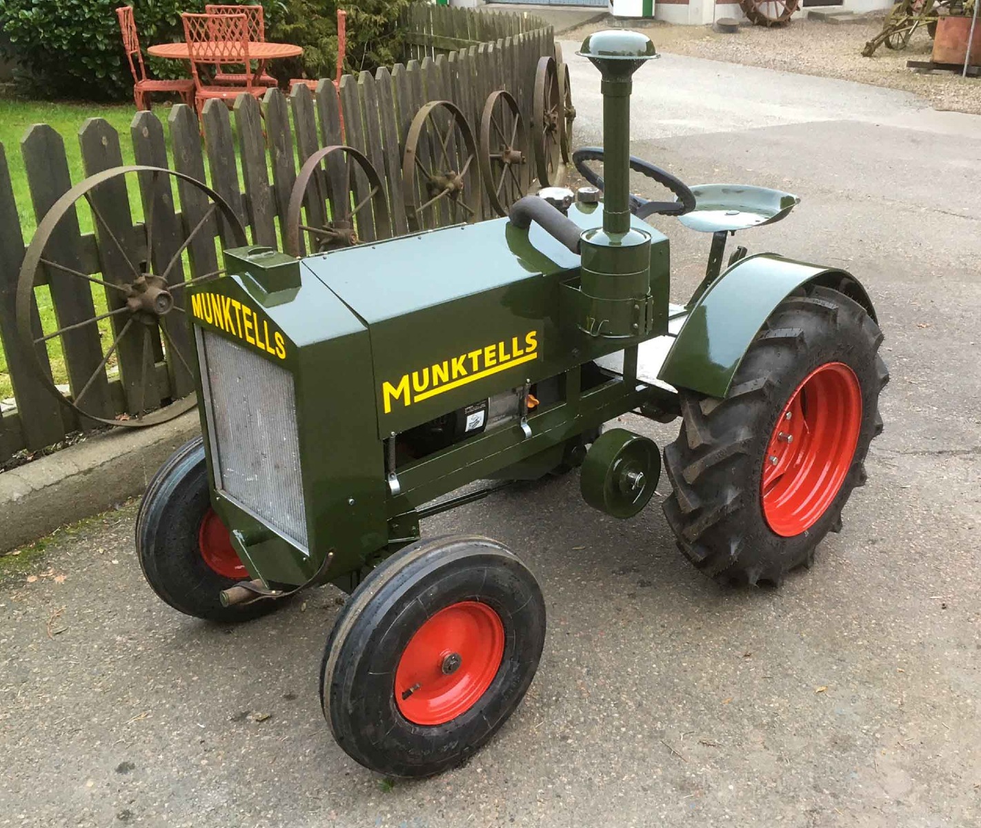 En dag innan jul kom en gammal kund och frågade om jag ville ha en jordfräs och man kan ju såklart inte säga nej. Tankarna gick. Jag har tidigare gjort fyra modeller av Munktells 25 men ingen som går att köra med. Nu kom chansen, vi kör! Jordfräsen har ju både fram och back och en fin 196cc motor. Det blev en del utmaningar. Det fanns inget stöd för drivaxlarna så jag fick hitta på! Framvagn hittade jag från en åkklippare, skärmar från oljefat, sitsen av en stekpanna, spakar från Morris, huvar av aluplåt, bakfälgar MB och drivaxlar Ford. Man tar vad man har! Bygget påbörjades den 4e januari och var klart den 25e januari. Kommer att visas på årsmötet hos Roger på restaurang Mat & Harmoni. Hälsningar Sven